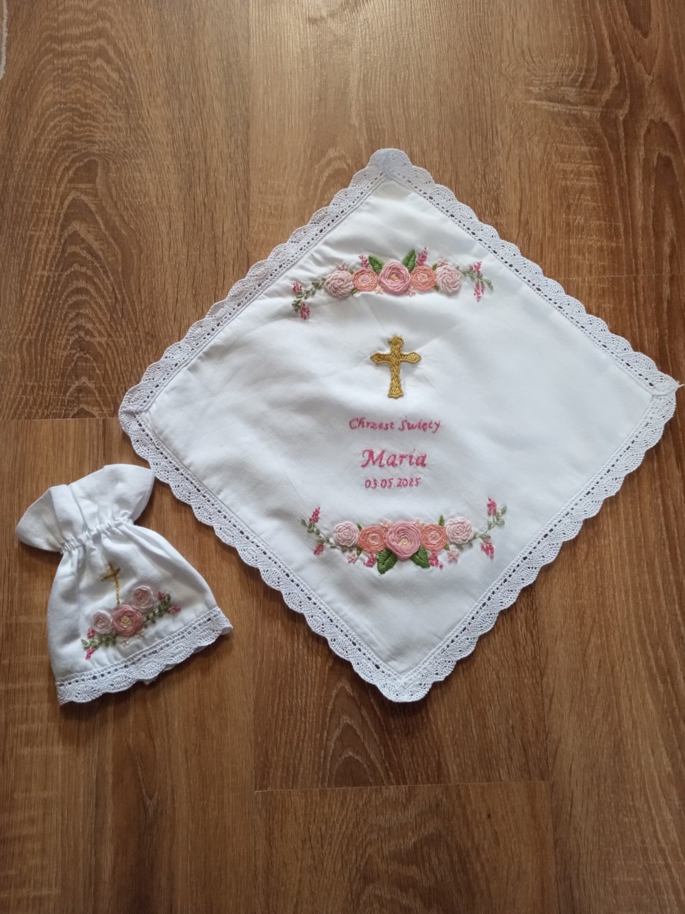 Na szatce wyhaftowane jest imię i nazwisko dziecka oraz data Chrztu.